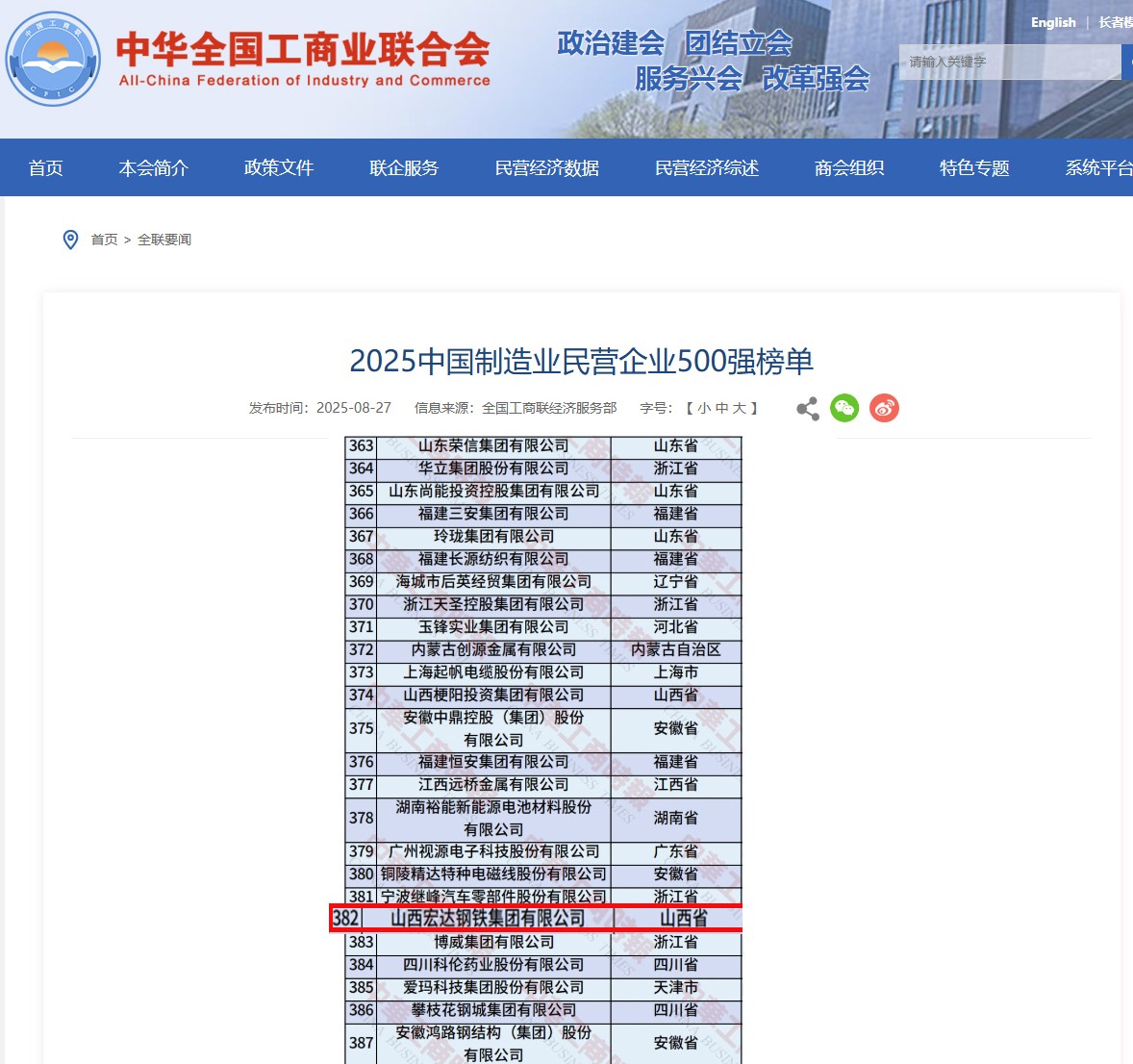 8月28日,全國工商聯(lián)發(fā)布2025中國制造業(yè)民營企業(yè)500強榜單,山西宏達鋼鐵集團再一次蟬聯(lián)上榜,位列“2025中國制造業(yè)民營企業(yè)”第382位,與上年相比,排位大幅提升。